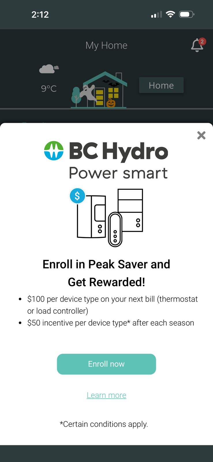 Here's where you can really save money. Every year, BC Hydro has a Peak Saver program that is active from Nov 1 to Mar 31. During that time, we are bound to have occasional peak energy events. For example, imagine it gets super cold and everyone is using a lot of electricity at the same time. This is usually in the morning and evenings. These peak energy events put a lot of pressure on the electrical grid. That's why BC Hydro created this program. As customers, they reward us for not using a lot of electricity during peak events. Best of all, it can happen automatically with smart devices that work with the Peak Saver program. All you have to do is enrol them into the program.